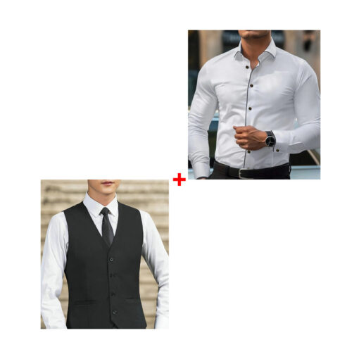 Bundle of Men’s White Contrast Lapel Dress Shirt and Slim-Fit Suit Vest with Four Buttons